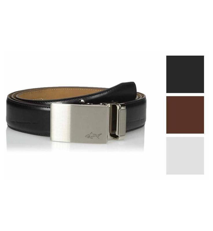 - Fully adjustable for perfect sizing, this Greg Norman belt is crafted in genuine leather with an adjustable ratchet slide mechanism for the optimum fit. It's designed with no buckle holes so it adjusts from size 32 to 44 or anywhere in between. A shark logo detail on the buckle adds signature Greg Norman style.